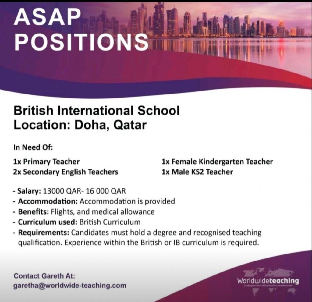 The British International School in Doha, Qatar is urgently looking for qualified and experienced teachers to join their academic team. If you have strong experience in the British curriculum or IB curriculum, this is an excellent opportunity to develop your teaching career in a reputable international environment.